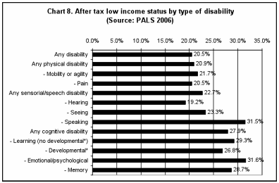 Statistics Canada (2009a) has developed several measures of low income. The only measure that is available on the 2006 PALS data file, however, is the Low Income Cut-Off (LICO). The LICO is defined as the household income level where a household spends 20% or more than the average on food, shelter and clothing. When calculating LICOs, Statistics Canada takes into account the number of people in the household and the population size of the community in which the household is situated (Statistics Canada, 2008c). Statistics Canada calculates both before tax and after tax LICOs. The present report uses the after tax LICO, which reflects disposable income after taxes are paid and tax credits are taken into account, such as the Disability Tax Credit and the Medical Expenses Tax Credit. It is important for the reader to bear in mind that the LICO does not take into account the out-of-pocket cash value of non-insured disability-specific expenses such as the cost of aids and devices for mobility (e.g., wheelchairs), communication (voice amplifiers, keyboard devices), learning (e.g., Braille output or speech access devices for computers, talking books), medications (e.g., for psychological well-being or pain management) or services (e.g., attendants, tutors, note takers, sign language interpreters). That is, the LICO likely underestimates 'poverty' by some unknown measure for people with disabilities who face such costs.